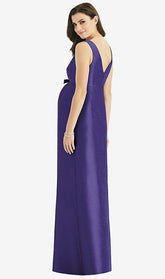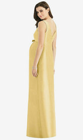 きらめくサテンツイルが上品な輝きを放つ、ノースリーブのマタニティドレスです。特別な日を美しく彩る、エレガントなシルエットの一着。
