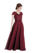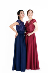 半袖レースのトップとふんわり広がるシフォンスカートロングドレス