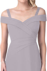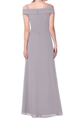 デコルテラインが美しく見えるオフショルダーデザインのロングドレス