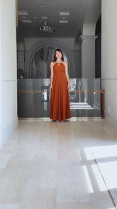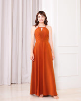胸元のカットアウトが可愛い、シンプルなホルターネックロングドレス