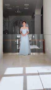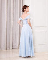 ギャザーたっぷりのビスチェにオフショルダーがデザインされた愛らしいロングドレス