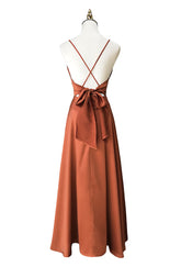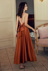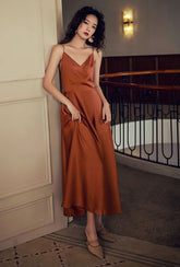 ソフトサテンのテラコッタカラー、ミモレ丈ドレス